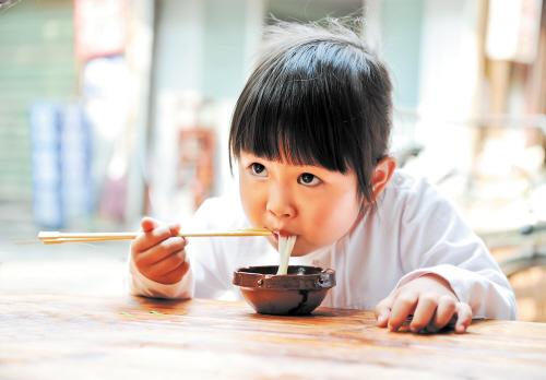 图为南门口一位吃粉的可爱小女孩。晚清民国初,长沙人时兴吃碱面,抗战爆发,面粉来源断绝,长沙流行吃米粉,直到现在。