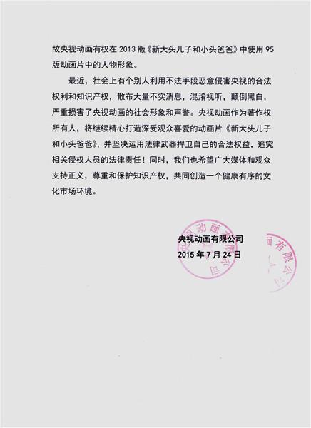 声明中也就95版及2013版大头儿子动画片创作及授权等情况进行了说明:1995年版《大头儿子和小头爸爸》动画片中使用的“大头儿子”、“小头爸爸”、“围裙妈妈”三个人物的完整形象是由央视组织的美术创作团队在央视支持下,代表央视意志创作,并最终由央视承担责任的作品,故央视应视为该演绎作品的作者,享有著作权。2007年,因中央电视台动画部建制转制,由央视投资成立了央视动画有限公司。根据央视的授权,央视动画有限公司有权行使95版动画片的全部著作权及动画片中包括但不限于文学剧本、造型设计、美术设计等作品除署名权之外的全部著作权,这就说明95年版《大头儿子和小头爸爸》和2013年版《新大头儿子和小头爸爸》的全部著作权均归属央视动画所有。