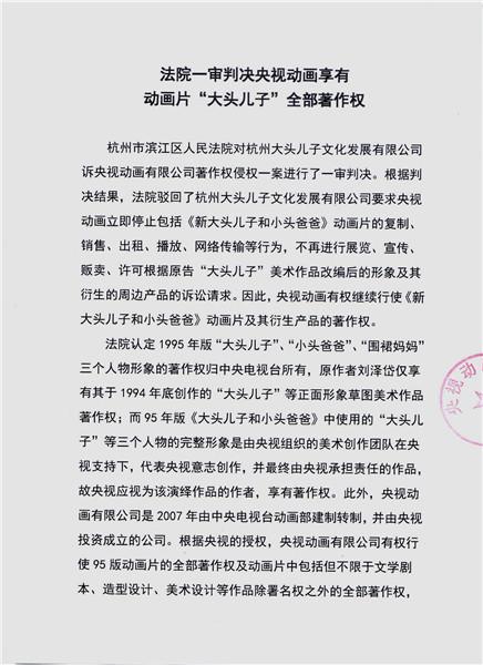 动画片《大头儿子和小头爸爸》1995年在央视首播,播出伊始便取得了巨大成功,成为当年现象级的一部动画作品。2013年,央视动画又创作播出了《新大头儿子和小头爸爸》动画片,次年上映了电影《新大头儿子和小头爸爸之秘密计划》,取得良好票房成绩。今年7月21日,杭州市滨江区人民法院对杭州大头儿子文化发展有限公司诉央视动画有限公司著作权侵权一案进行了一审判决。随后有媒体针对此事进行报道,断章取义,只提称判决结果认定央视动画侵权事实成立,判令央视动画赔偿杭州某公司经济损失126万余元。针对此事,央视动画日前做出声明。