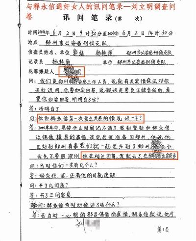 对释永信的询问笔录,只有第一页,显示释永信报案称遭刘某明敲诈,询问时间是2004年5月29日9时10分至11时30分,侦查员是郑州市公安局刑侦支队丁某、刘某,询问地点是郑州市未来大酒店。而对刘某明的询问笔录共6张,询问时间是2004年6月2日9时50分至14时30分,地点是郑州市公安局刑侦支队,侦查员为郭某、杨某。在询问笔录中显示,刘某明称多次与释永信发生性关系。
