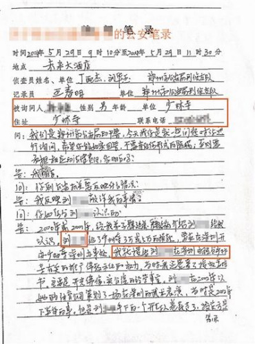 一名民警表示,从第一份笔录上看,关于释永信本人的问话地点在未来大酒店,不过问话地点按道理一般会写具体哪个房间号。第二,根据材料显示,办案机构是郑州市公安局刑侦支队,“还是级别较高的”。该名民警介绍,一般敲诈案报警都会在分局刑侦大队配合调查,如果真的是其本人,很有可能特事特办。第三,字迹比较像女民警的,这也符合如果当事人为女性,一般要有女民警在场的规定。