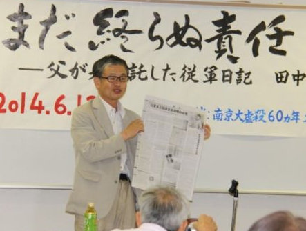 2014年6月13日晚,田中信幸在大阪的一场题为“尚无结束的责任——父亲托付给我的《从军日记》”的演讲中,向近百名日本民众介绍《人民日报》“让更多人知道日本侵略实情——《从军日记》背后的故事”的专版。刘军国 摄