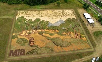 将名画制作成蛋糕、比萨?日前,艺术家们又有了新的设计。据外媒报道,64岁的艺术家斯坦在美国明尼苏达州以大地为画布,将梵高的画作《橄榄树》在大地上呈现出来。
