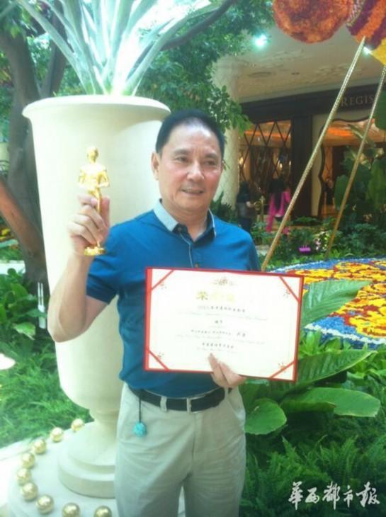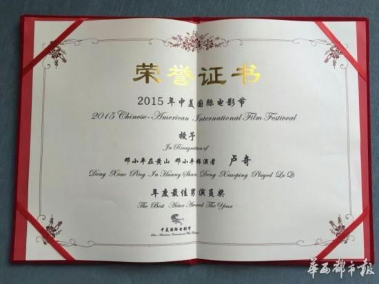 华西都市报讯(客户端记者 杜恩湖) 9月28日中午,华西都市报记者从美国洛杉机“中美国际电影节”组委会获悉:在电影《邓小平在黄山》中成功塑造了邓小平的川籍表演艺术家卢奇,荣获了中美国际电影节最佳男演员奖。28日,华西都市报记者电话连线正在美国参加文化活动的卢奇,他证实:“我已在美国领到了奖杯。”