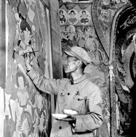 段文杰在敦煌壁画前描摹修复。