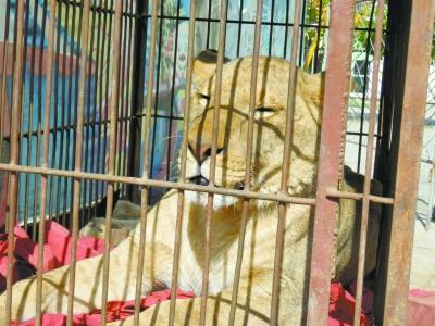 10月11日上午,记者来到马戏团表演现场,见到了野生动物表演的节目。在马戏团门外的铁笼里,一只母狮子无精打采地趴着,两眼无神。这只非洲狮不是演员更不表演节目,而是放在外面招揽生意的。一些小朋友们被狮子吸引,走到笼子边,几乎能摸到狮子。狮子并无动作,就那么一直趴着,既没有意图攻击,也没想躲避。