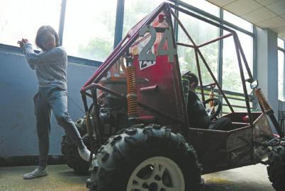 这个总重270多公斤的家伙,就是这群女生全手工打造的赛车。据介绍,车队成员共8个人,6名女生负责了赛车的设计、避震、传动、发动机、制动甚至焊接等主要工作。“还有两名男生,来的时间不长,主要是因为有些体力活需要他们做。”秦小艳笑着说。