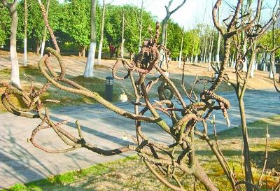 微访(双V记者杨宣义 记者陈嫣然)枝条扭曲成结,究竟是自然生长形成,还是人为造成?最近,月湖公园里,几棵枝条呈现出平结的开花小树,勾起了不少市民的好奇心。