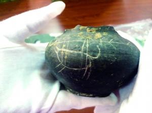 在标本库房,尽管都是破碎的陶片,但有些上面画着神秘的符号。其中一块黑陶片上,刻画着一个圆圈,下面一个十字形,尽管有些歪斜,但有专家开玩笑说,“你看,那不就是最早的女性标志吗?”不仅陶片上有符号,出土的陶器上也有。其中一个小黑陶壶上,先民们用利器画出了两幅狩猎图:一根树枝上捆吊着一头长着獠牙的野猪,四条腿耷拉着,头和尾巴却翘起,似乎还在挣扎,野猪的背面是一只正在飞奔的鹿。