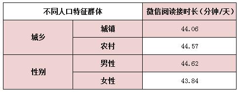 从性别来看,不同性别居民的微信阅读时长也较为接近,男性居民的微信阅读时长为44.62分钟,女性居民微信阅读时长则为43.84分钟。