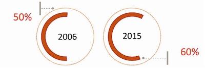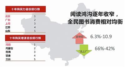 值得注意的是,十年间国民阅读地域鸿沟逐年收窄,全民图书消费相对均衡。北上广图书消费占比从2006年的66%下降至2015年42%。而十年整体排名后半段的省份图书消费占比从2006年的6.3%提升至2015年10.9%。