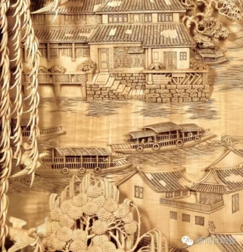 在此件作品之中,黄小明大师充分结合了深浅浮雕技法,感性而细腻的雕工,刻画出了作品中每一个元素的细节,巧妙的布局,更使画面的立体感与空间感十足。此外,作品采用了东阳木雕中的叠雕技法,以纤细而摇曳的柳枝与穿梭其间的燕子作为前景,透过柳枝而展现出一幅完整而生动的江南美景。