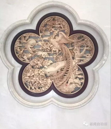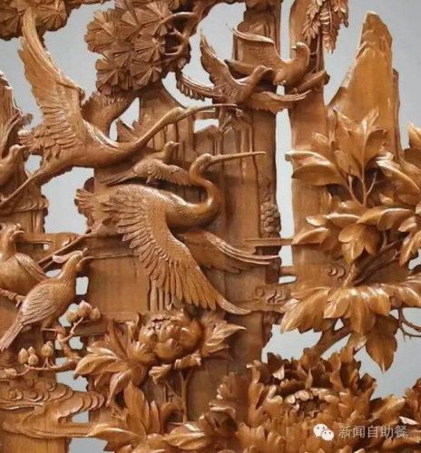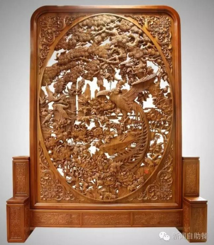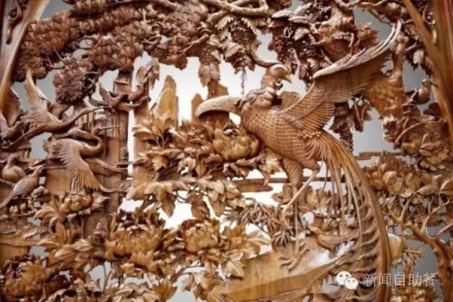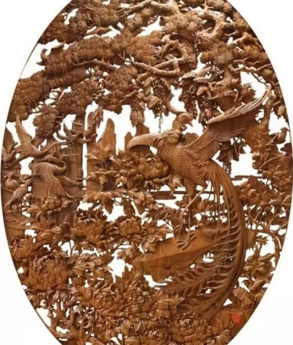 《丹凤朝阳》之中,松荫如盖,牡丹铺锦,一片花团锦簇的春色中,百鸟翩翩来朝,流光溢彩的丹凤犹如朝阳,王者气势,不怒自威。繁复富丽的画面元素,黄小明大师却选择用东阳木雕的镂空雕技法予以表现,其难度不言自明。