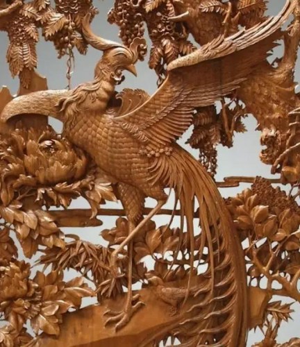 作品材质选用了号称缅甸国宝的柚木,柚木号称“万木之王”,材质的特性与作品表达的主题相得益彰。柚木油脂丰富,散发金黄色光泽,用于表现凤凰的高贵与气质可谓是不二之选。此件作品中,作者采用了东阳木雕中双面镂空雕的技法,使作品所表现元素的立体感更为强烈,大大增强了作品的观赏性。