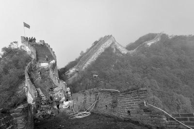 昨天,位于怀柔区西北八道河乡境内的箭扣长城上,数十名工人正在对长城进行抢修加固。据了解,由于未开发长城损毁较重,目前已施工两个多月,完成30%工程量,仍在紧张修缮中。专家建议,仅靠修缮还不够,希望政府尽快作出景区建设规划。