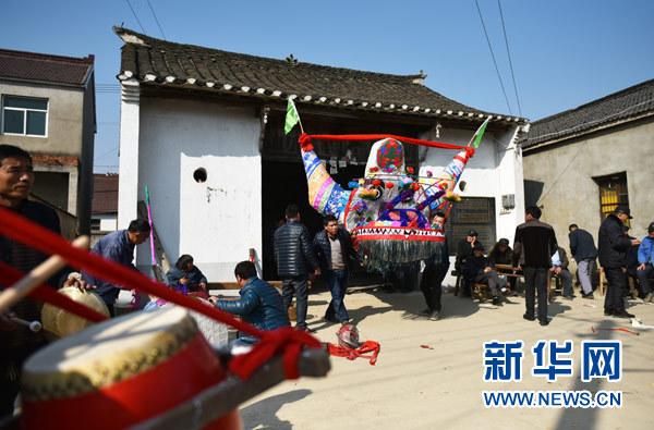 在锣鼓声中,村民们把制作好的龙头搬运出来。(应康伟 摄)