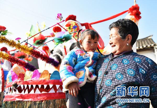 村里的老奶奶带着小孙女来看舞龙。(应康伟 摄)