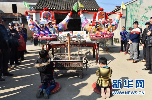 仪式上,村里的小孩子正在跪拜。(应康伟 摄)