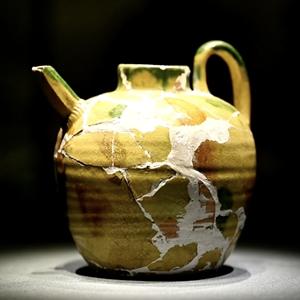 这是此次“唐三彩窑产品比较展”展出的黄釉彩绘注壶。(王笑楠 摄)