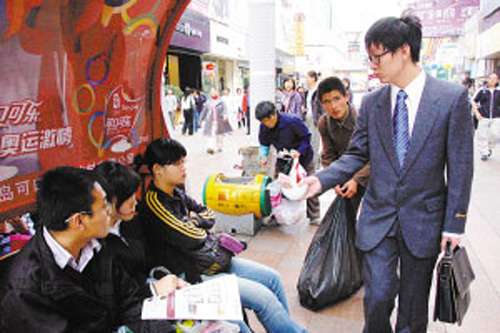 近日,青岛闹市出现稀罕场面,几名西服革履的青年男子,一手提着高档公文包,一手捧着“讨饭碗”,见到人也不说话,把碗递过去,等待别人施舍。此行为引起市民的怀疑,而当事人则自称这是“行为艺术”。