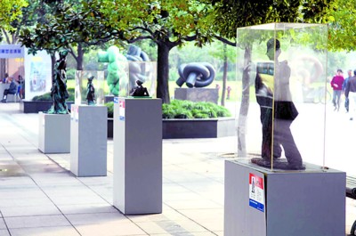 在面对国际饭店的绿化带里,城市雕塑邀请展已经办了八届,每一届的雕塑,都给游人留下了深刻的印象和高雅的享受,这次又有两位来自中国和荷兰的艺术家在此奉献作品。但记者看到,一位艺术家的小件青铜雕塑被用有机玻璃罩了起来,显得特别突兀。负责照顾展览的一位阿姨说,因为小雕塑发生过失窃事件,至今没有下落,所以现在小雕塑已经用有机玻璃罩了起来。至于作品的价值,据悉这些作品是可以出售的,最近还有人以200万元的价格买了三件。