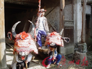 据廖师傅介绍,牛身先用竹篾扎成框架,再在框架外糊纸贴布制成,极易破烂,几乎舞一次就要重新制作。因为很多年没有舞“春牛”了,“春牛”也只剩下旧牛头。对于此次南下东莞参加民间艺术节,廖师傅表示难于成行,因为修复“春牛”不容易,会扎“春牛”的民间艺人少之又少。而且加上演员、鼓乐队员、唱春牛的艺人,整支队伍人员要有25~30人左右。村里的年轻人大部分南下珠三角务工,要等到春节才能回来,村里只剩下几名上了年纪的队员,根本无法排练。廖师傅颇为遗憾地说,这些年以来,几乎没有舞过“春牛”了。