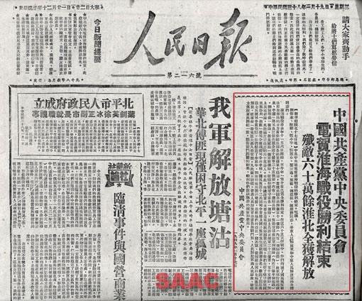 5.1949年1月19日,《人民日报》刊登的中共中央对淮海战役胜利结束的贺电