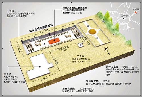 根据考古发掘资料,秦俑一号坑是一个东西向的长方形坑,坑东西两端有长廊,南北两侧各有一边廊,中间为九条东西向过洞,过洞之间以夯土墙间隔,估计埋有约6000个真人真马大小的陶俑。专家推测,一号坑内秦俑有前锋和左右两翼,中间战车与步兵相杂,其排列象征着宿卫秦始皇京城咸阳的矩形混编部队——宿卫军,并与二、三号坑的秦俑分属左、中、右三军,属于军阵。
