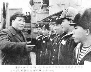 当时跟着毛主席一起来视察的有公安部长罗瑞卿、华东军区司令员陈毅、参谋长张爱萍。毛主席身着土黄色的风衣,在蒙蒙的细雨中,面带微笑,他和所有同志握手,并且都问了姓名、职务。“第六舰队刘司令向主席介绍了我,主席问我,‘噢,我看你很年轻嘛,你多大岁数?’我的心怦怦地直跳,慌乱地回答说,‘43’。话刚出口,我立刻觉得不对了,赶快改口说:‘不对,33’。”