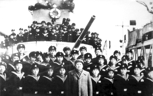 在舰上,毛主席看望了战士们以后,便到了后主炮“130”大炮的前面看操演。冯尚贤开始指挥来这里接受检阅的舰艇,毛主席看了很满意。之后,一行人就到了会议室。