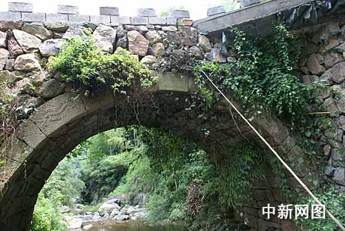 首座发现的蜈蚣桥位于鸬鸟镇天平山村凌村坞盛家头,呈南北向横跨太平溪上游支流之上。这座单孔石拱桥采用块石横联分节砌置法建造,桥长11.9米,宽3.15米,高约6米。桥侧上游方向刻有“积善桥 民国八年冬日 建”字样,桥名两侧浮雕了一对蜈蚣,南北对称,栩栩如生,非常精美。