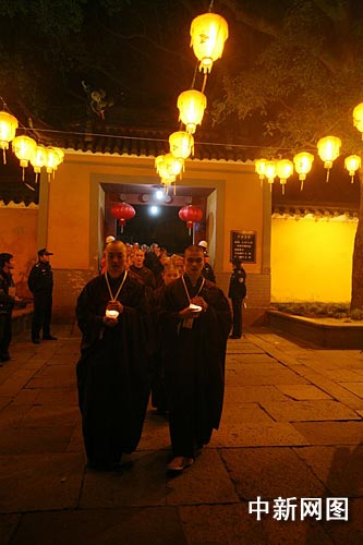 在现场,一位60多岁的老太太一边双手合十作揖,一边从法师手里虔诚地接过心灯,她告诉记者:“她信观音,拜观音,所以这么大年纪了坚持要来参加这个活动。”她还说,一进入普济寺,就被各式各样的莲花灯迷住了,一边听着悠扬佛乐,一边看着音乐喷泉,感觉就好像真的进入了人间净土。