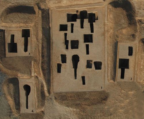 其中元代墓葬2座,因早年盗扰,除出土碎砖及白瓷残片外,墓室中没有发现任何遗物。清代墓葬16座,出土有黑釉瓷碗、双系带流黑釉瓷灯、盘式黑釉瓷灯、灰色板瓦、铜钱等100余件。该古墓群竖穴土坑墓8座,带墓道洞室墓8座,带墓道竖穴土圹墓2座。双人合葬墓11座,四人合葬墓1座,三人合葬墓1座,单人单葬墓1座,涉及二次迁葬墓4座。葬具多为木棺,葬式均仰身直肢葬,多数墓葬主人头骨下枕有板瓦,少数板瓦面上墨书“安魂镇墓大士指引”题记,并绘有朱丹咒符图纹。虽然发掘过程中没有发现有关祖属问题的直接文字材料,但根据墓葬结构和出土文物看,此墓地是一处清代平民家族墓地。