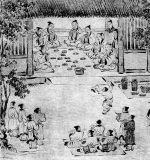从西周时代开始,我国就已建立了一套比较规范的饮酒礼仪,它成了那个礼制社会的重要礼法之一。西周饮酒礼仪可以概括为4个字:时、序、效、令。时,指严格掌握饮酒的时间,只能在冠礼、婚礼、丧礼、祭礼或喜庆典礼的场合下进饮,违时视为违礼。序,指在饮酒时,遵循先天、地、鬼、神,后长、幼、尊、卑的顺序,违序也视为违礼。效,指在饮时不可发狂,适量而止,三爵即止,过量亦视为违礼。令,指在酒筵上要服从酒官意志,不能随心所欲,不服也视为违礼。