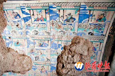 石窑紧贴峭壁壁画栩栩如生