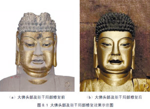 在修复后,金大佛面部的雕刻手法将更细腻,线条将更优美,眼角处的细小纹路和微笑的嘴部动作,将使佛祖看起来更加亲切。发髻的修复与补全将恢复头部的完整性和协调性;而肩部至躯干及裙摆在修复之后,将与脸部有逐渐过渡的层次感,展现出从鲜亮至暗淡的“推蕴效果”,体现出大佛的悠久历史和文化底蕴。
