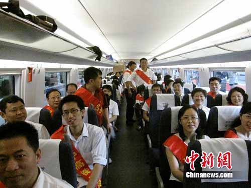 中新网南京7月1日电(记者 唐娟 实习生 吴炜)7月1日早上8点零3分,在鼓乐声中,从南京发往上海虹桥的“G5001”城际高速列车从南京火车站驶出。标志着中国第二条城际铁路——沪宁城际铁路正式运营通车,这条全长301公里,最高时速可达350公里/小时的铁路,仅用二年时间就建成运营。被铁道部称为中国铁路建设速度最短、标准最稿、运营速度最快、配套设施最全、一次建成里程最长的城际列车。据了解,车上的许多乘客是为体验最快列车而来。