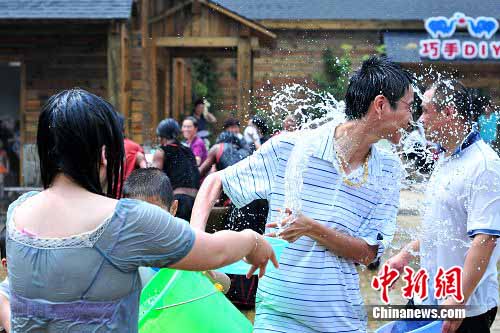 “泼水大战”开始了!记者在现场看到,没有这一文化传统的汉族人,刚开始有点“缩手缩脚”,但是在少数民族姑娘和小伙的带动下,情绪迅速升温,没过几分钟,不分男女老少就“毫不留情”的互相泼水。才一会儿,所有人员就通通浑身湿透了。