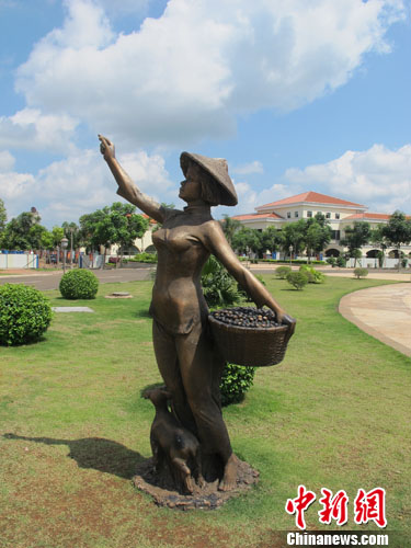 澄迈县盛产咖啡,该县的福山咖啡文化风情镇定位为一个世界咖啡交易平台,一个新的旅游休闲度假胜地,也是澄迈一个集中展示自我的大舞台。图为咖啡文化风情镇内的雕塑。 中新网 何敏 摄