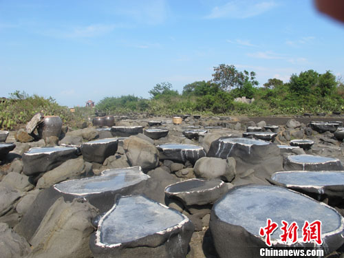 据介绍,儋州千年古盐田是我国最早也是最后一个日晒制盐点,距今1200多年,总面积750亩,有7300多个形态各异的砚式盐槽,年产量500吨。千百年来,沧海桑田,如今在现代化厂区林立的洋浦经济开发区内,盐田村人依然在古老的盐田里沿袭着1200多年来古老的制盐技艺,被人们称为洋浦最早的“工业”。
