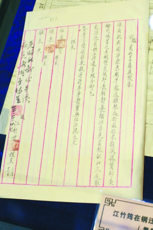 江姐重钢亲笔辞职信展出 曾用名“江竹君”(图)