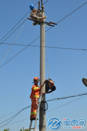 惠安一男子倒挂电线杆 遭万伏高压电击奇迹生还