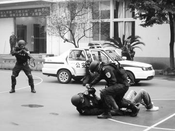 昨日,在快反突击队成立演习中,记者见证了这支队伍的威力。演习现场,只见一名“歹徒”手持菜刀疯狂追击群众。“救命啊!”群众四处奔跑,几分钟后,随着呼啸的警笛声,两辆警车赶到事发现场。一辆警车从前方将“歹徒”堵住,另一辆警车从后方将“歹徒”围住。几名高大威武、手持长短枪的特警从警车跳下。端枪、瞄准,“砰”一声巨响,一张红色大网将不远处的“歹徒”罩住,一名警察用网枪堵住“歹徒”,另一名警察一个箭步跑到“歹徒”身边将其擒获。短短两分钟,这名“歹徒”被制服。