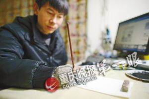 男子遇意外仅剩1根大拇指 苦练7年靠绘画养家(图)