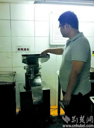 洗碗间一角,安装着一台餐厨垃圾处理机。“剩菜从入料口投入,被粉碎成浆状,再用不锈钢密封容器运走,不会有一点撒漏。”工作人员说,每个容器可装40公斤浆液,便于人工搬运。