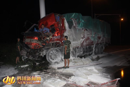 四川绵阳两货车追尾 一车撞电线杆车头变麻花(图)