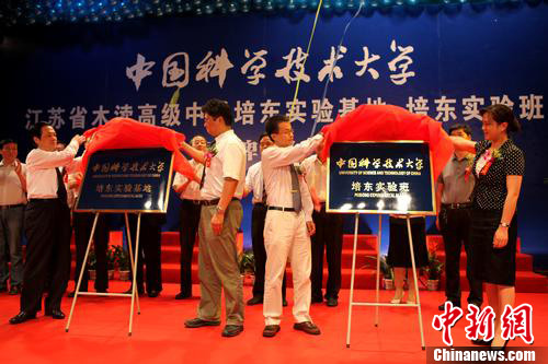 中新网苏州6月29日电(李克祥)29日上午,中国科技大学培东实验基地、培东实验班在江苏省木渎高级中学揭牌。以两校校友、世界著名纳米科学家杨培东名字命名的“培东班”,寓意“培养东方之子”。通过这一新型合作模式,中科大与木渎中学将共同探索中学教育与大学教育的有机衔接,通过实施课程创新、学分考核制、跳级制等改革,“培东班”将尝试破解“钱学森之问”。