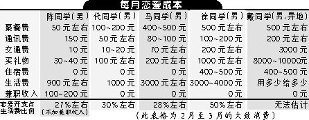 对每月只有1200元生活费的邱同学来说,每月恋爱开支都会达到800元左右。而这800元对一般的同学来说,却是一个月的生活费。邱同学告诉记者,自从家人知道他谈了恋爱后,姐姐会每个月多给他200多元的恋爱经费。