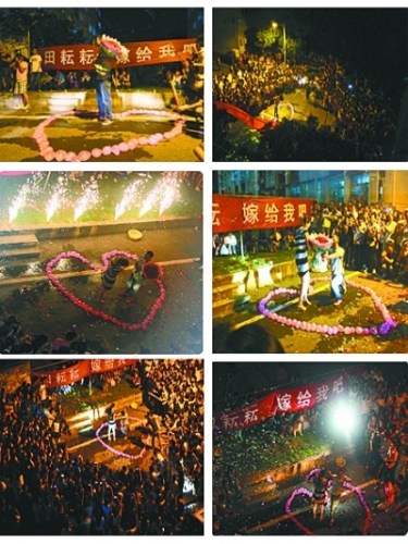 新浪微博 @唐-小婉:武纺求婚门,火了,汽车打灯,音乐,泡泡,闪光灯,烟火,气球,鲜花,戒指,跪地求婚,全校沸腾。