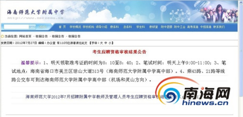 30日,南海网网友“浩然”给记者发来两张网页截图,称怀疑于7月28日举行的海南师范大学附属中学招聘考试存在不公平现象。